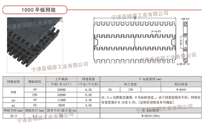 塑料網(wǎng)帶由鏈輪驅(qū)動,網(wǎng)帶節(jié)距主要有12.7mm、15.2mm、19.05mm、25.4mm、27.2mm、38.1mm、50.8mm、57.15mm,開孔率2%-48%