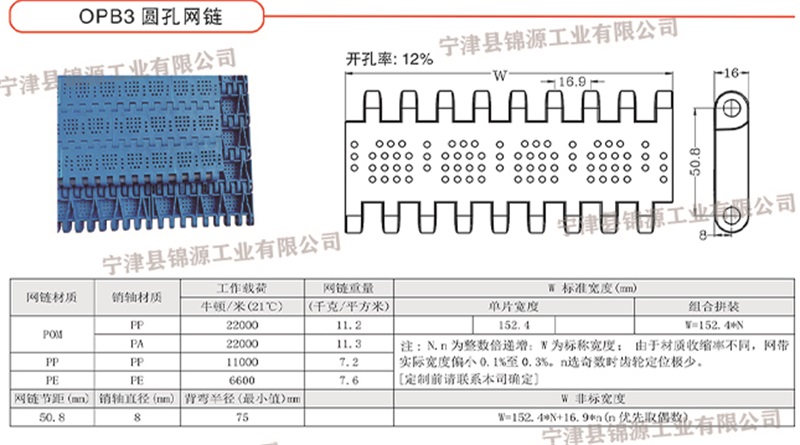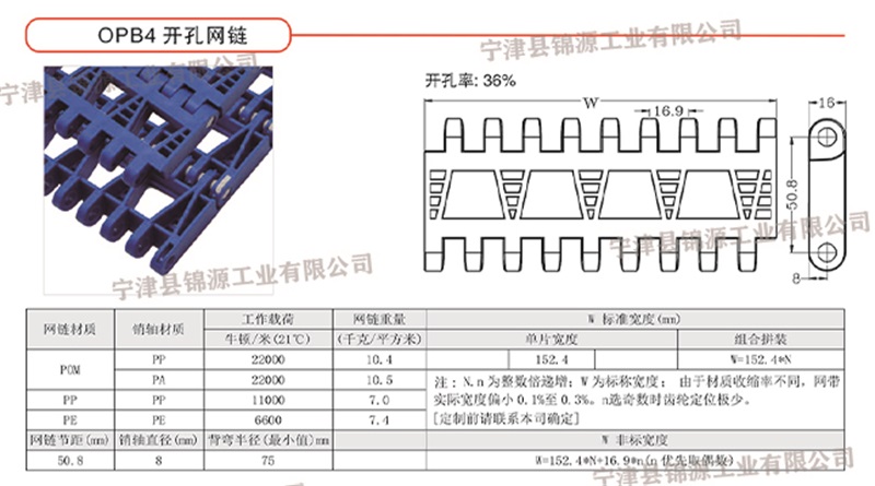 塑料網(wǎng)帶由鏈輪驅(qū)動(dòng),網(wǎng)帶節(jié)距主要有12.7mm、15.2mm、19.05mm、25.4mm、27.2mm、38.1mm、50.8mm、57.15mm,開(kāi)孔率2%-48%