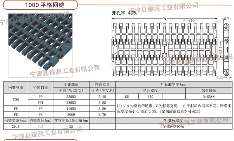 塑料網(wǎng)帶由鏈輪驅(qū)動,網(wǎng)帶節(jié)距主要有12.7mm、15.2mm、19.05mm、25.4mm、27.2mm、38.1mm、50.8mm、57.15mm,開孔率2%-48%