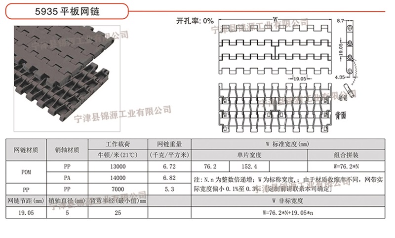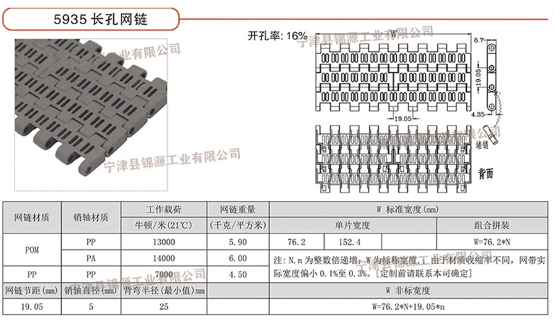 塑料網(wǎng)帶由鏈輪驅(qū)動(dòng),網(wǎng)帶節(jié)距主要有12.7mm、15.2mm、19.05mm、25.4mm、27.2mm、38.1mm、50.8mm、57.15mm,開孔率2%-48%